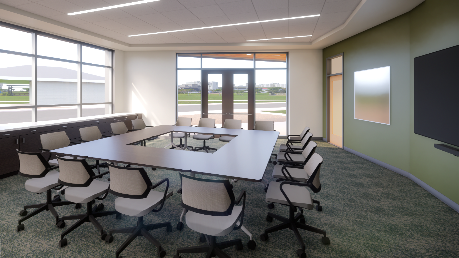 Pictured: Combined space; classroom and board room, arranged classroom-style